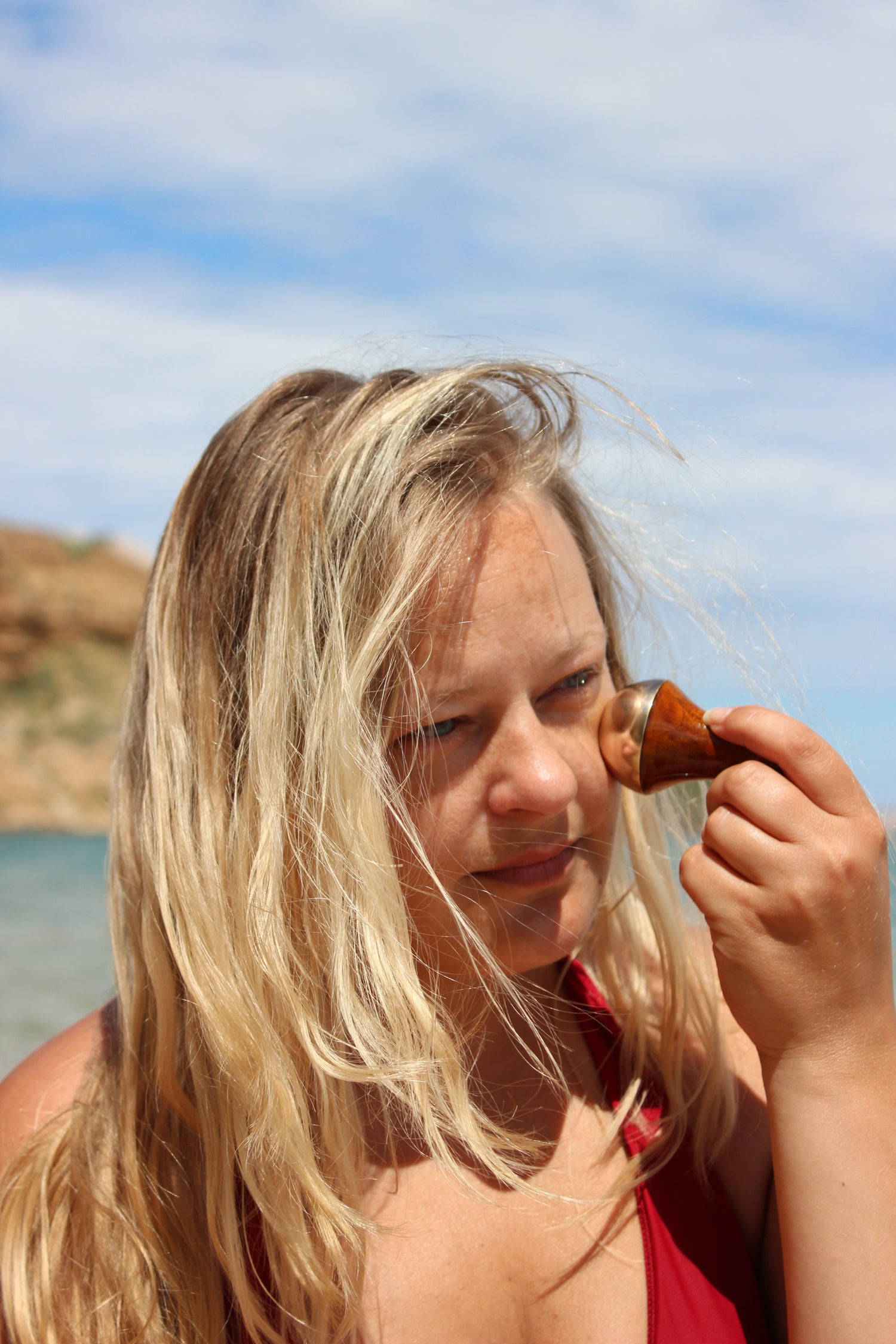 Scorri delicatamente il Mini Kansa Wand intorno all'area degli occhi, concentrandoti sulla zona sotto gli occhi, l'arcata sopraccigliare e gli angoli esterni.