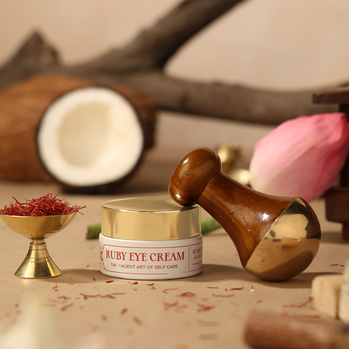 Vivi la pratica ayurvedica del Netra Abhyanga, un rituale rigenerante per la delicata zona degli occhi, con il Kumkumadi Eye Care Kit. Questo kit include la Ruby Eye Cream, una miscela lussuosa di zafferano ed erbe ayurvediche per idratare, illuminare e ridurre l'aspetto delle occhiaie e delle linee sottili, e il Mini Kansa Wand, progettato per un massaggio preciso dei punti marma per ripristinare l'equilibrio e migliorare la luminosità.