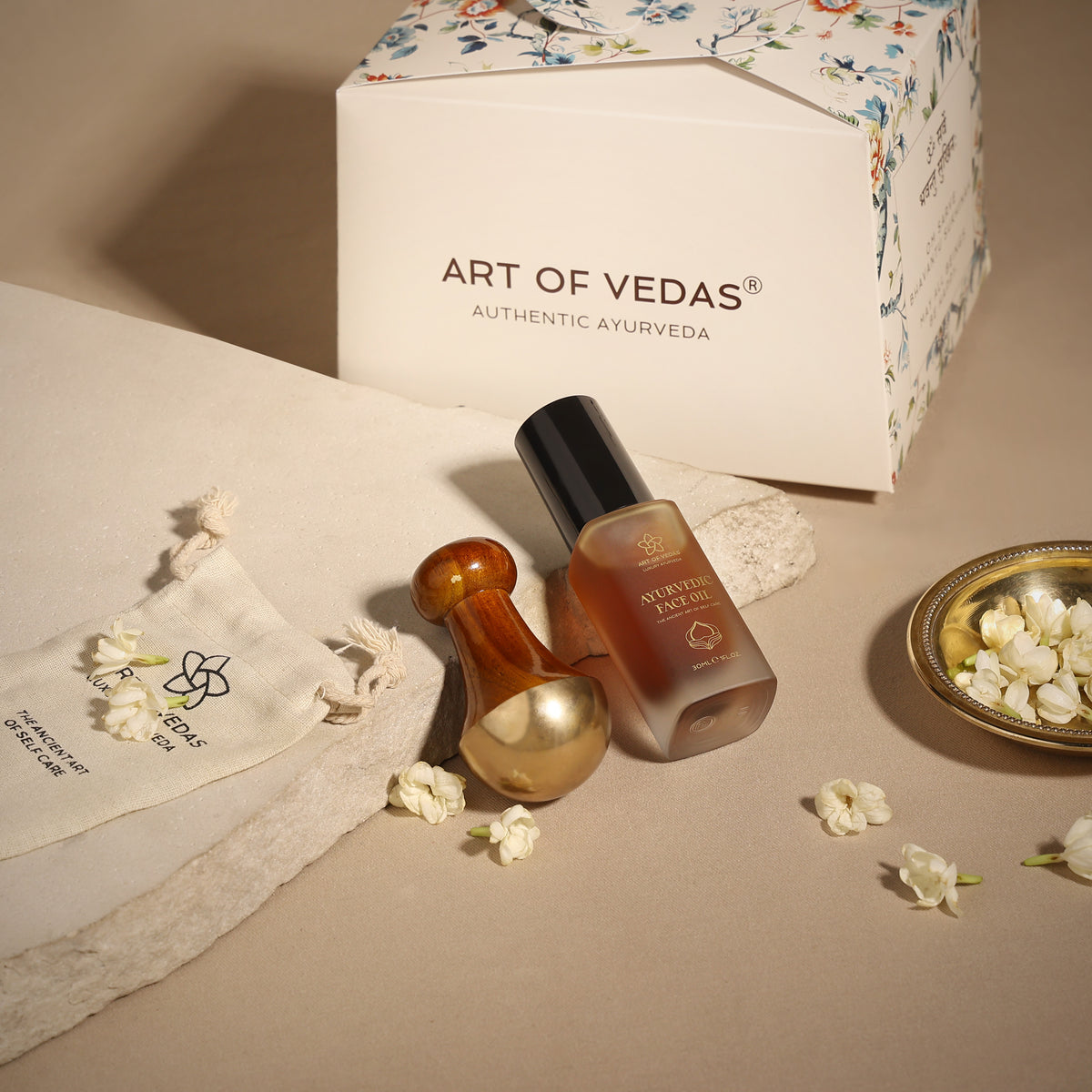 Inizia applicando alcune gocce di Ayurvedic Face Oil sulla pelle pulita e asciutta. Massaggialo delicatamente sul viso e sul collo con movimenti circolari verso l'alto. Questo passaggio fornisce una nutrizione profonda, preparando la pelle per un'assorbimento ottimale nei passaggi successivi.